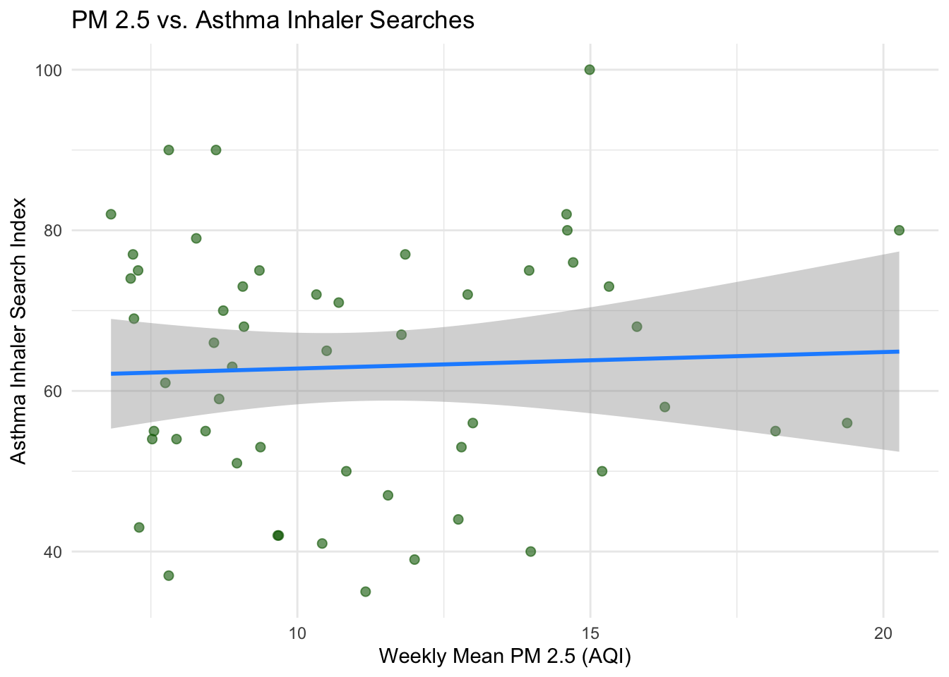 Interpretation: The coefficient on pm25_mean tells us the estimated change in the asthma inhaler search index associated with a one-unit increase in weekly mean AQI. But remember — this estimate is likely biased due to omitted variables.