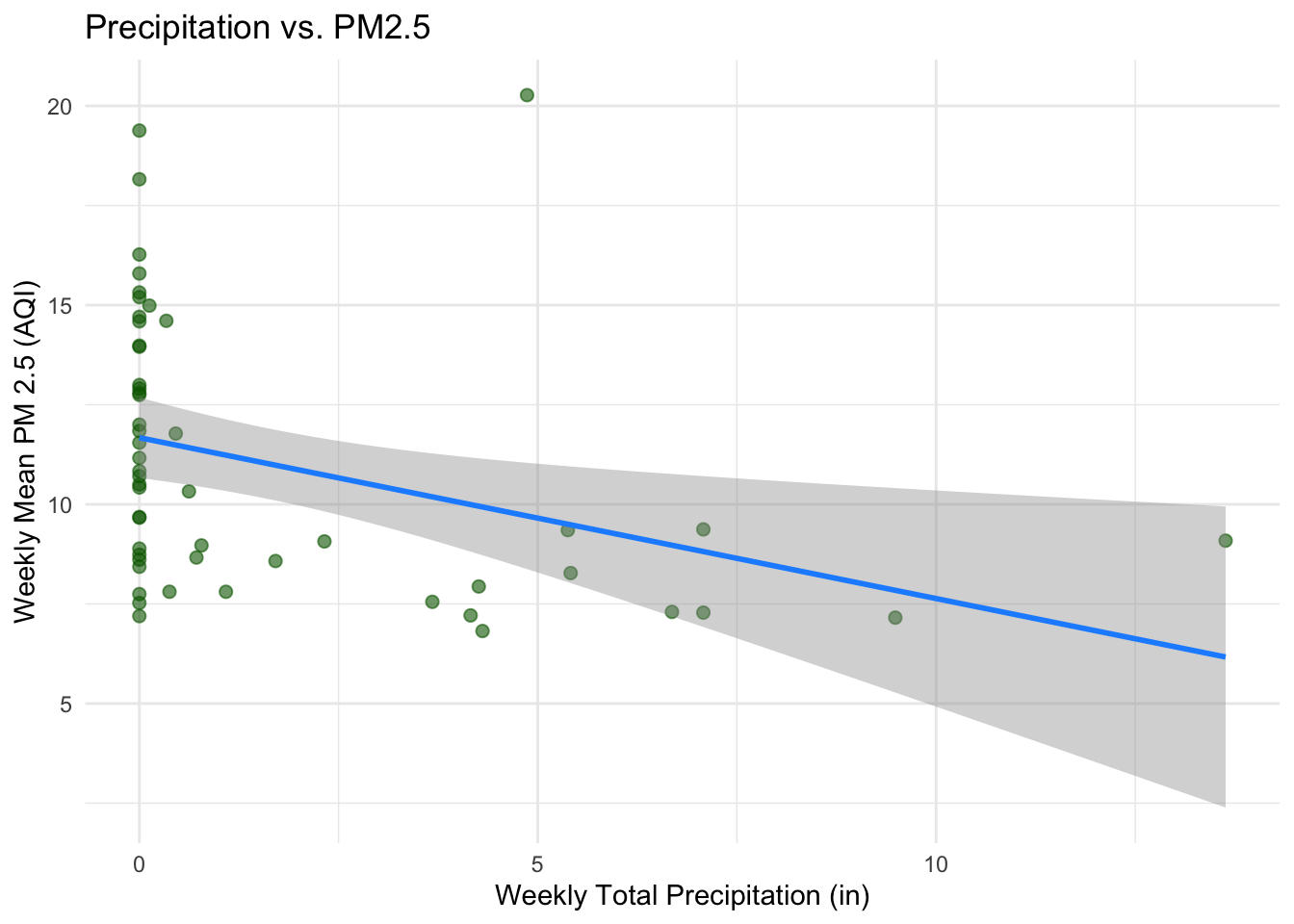 - Relevance: Rainfall is a mechanism for removing particulate matter from the atmosphere (“wet deposition”). Weeks with more rain should have lower PM2.5 — we can test this.